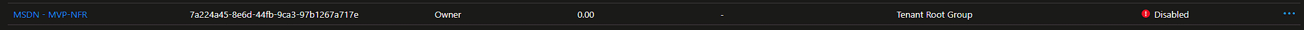 Acesse o menu Subscriptions. Note que assinaturas como a MSDN – MVP-NFR (comum para profissionais certificados e MVPs) aparecem com o status Disabled após o ciclo de renovação.